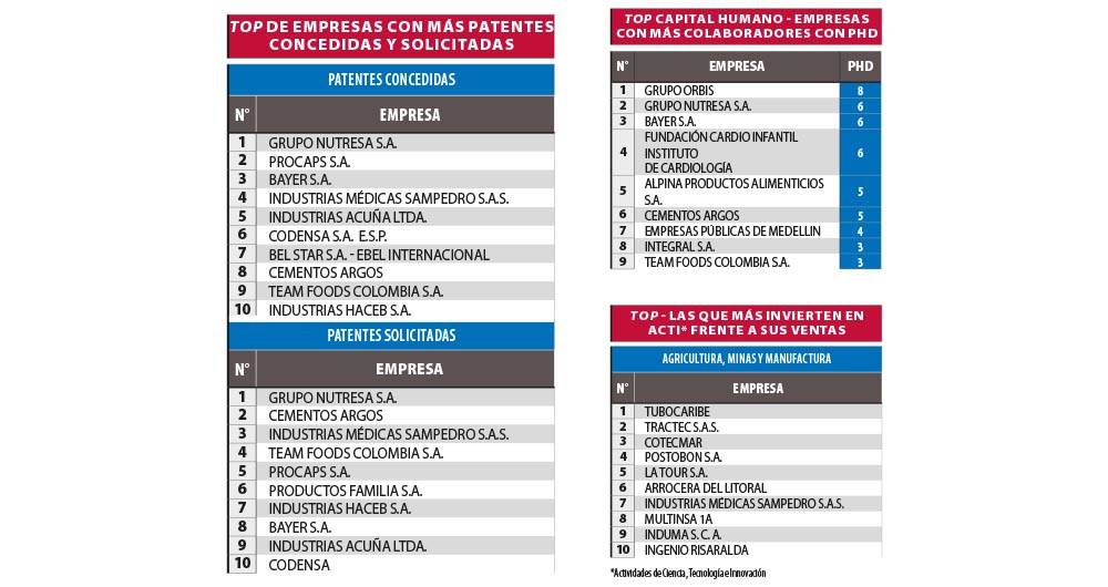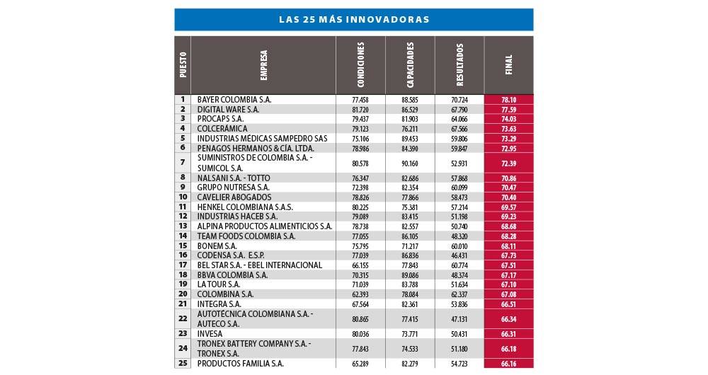 Este ejercicio produjo unos puntajes que permitieron elaborar el Primer Ranking de Innovación Empresarial, en cuyos primeros 10 lugares están las compañías Bayer Colombia, farmacéutica y productos agrícolas; Digital Ware, de software; Procaps, farmacéutica; Colcerámica, de manufacturas; Industrias Médicas Sampedro, especializada en dispositivos para solucionar problemas osteomusculares; Penagos Hermanos, especializada en fabricar máquinas para el agro; Sumicol, de insumos industriales, pinturas y materiales de construcción; Nalsani Totto, una compañía de moda; el Grupo Nutresa, una de las multilatinas de alimentos más importantes de la región, y Cavelier Abogados, una firma de servicios jurídicos. También se realizó en la encuesta una pregunta de percepción para identificar las firmas que el empresariado percibe como las más innovadoras, y la primera fue Alpina.