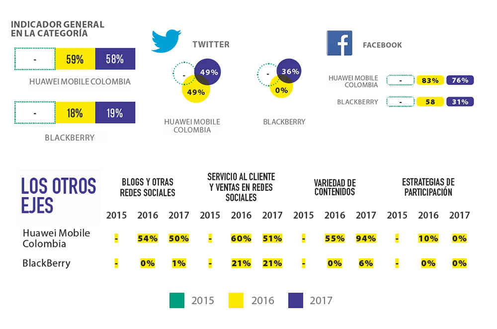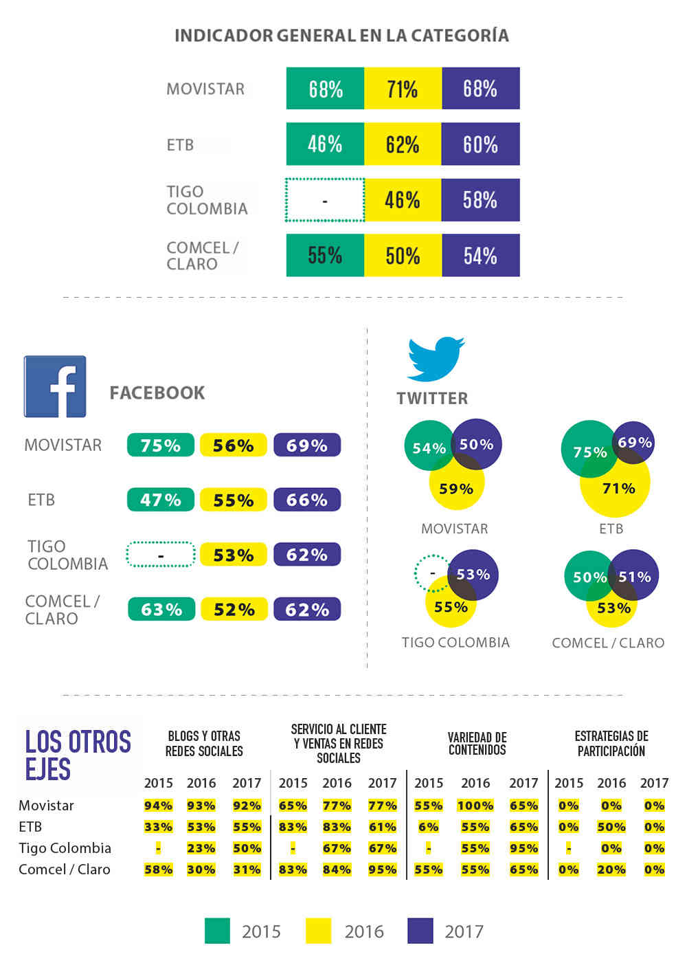 Aunque Movistar mantiene el liderazgo, seguido de ETB, estas dos marcas perdieron 3 y 2 puntos respectivamente frente al año pasado. Tigo Une tuvo el crecimiento más alto, al aumentar 12 puntos porcentuales, llegando a 58%, desplazando del tercer lugar a Claro, que quedó en 54%, 4 puntos más que en 2016. En Facebook, Movistar tiene el porcentaje más alto, con 69%, seguido de ETB con 66%. En Twitter, ETB alcanza el mayor registro –69%– y detrás Tigo, con 53%. Para blogs y otras redes sociales Movistar registra 92% y lo escolta ETB, con 55%. Tigo tiene en variedad de contenido 95% y es donde más se destaca. En este eje las demás marcas alcanzan, cada una de ellas, 65%. Para Claro, su mayor fortaleza está en el eje de servicio al cliente y ventas en redes sociales, con 95%.