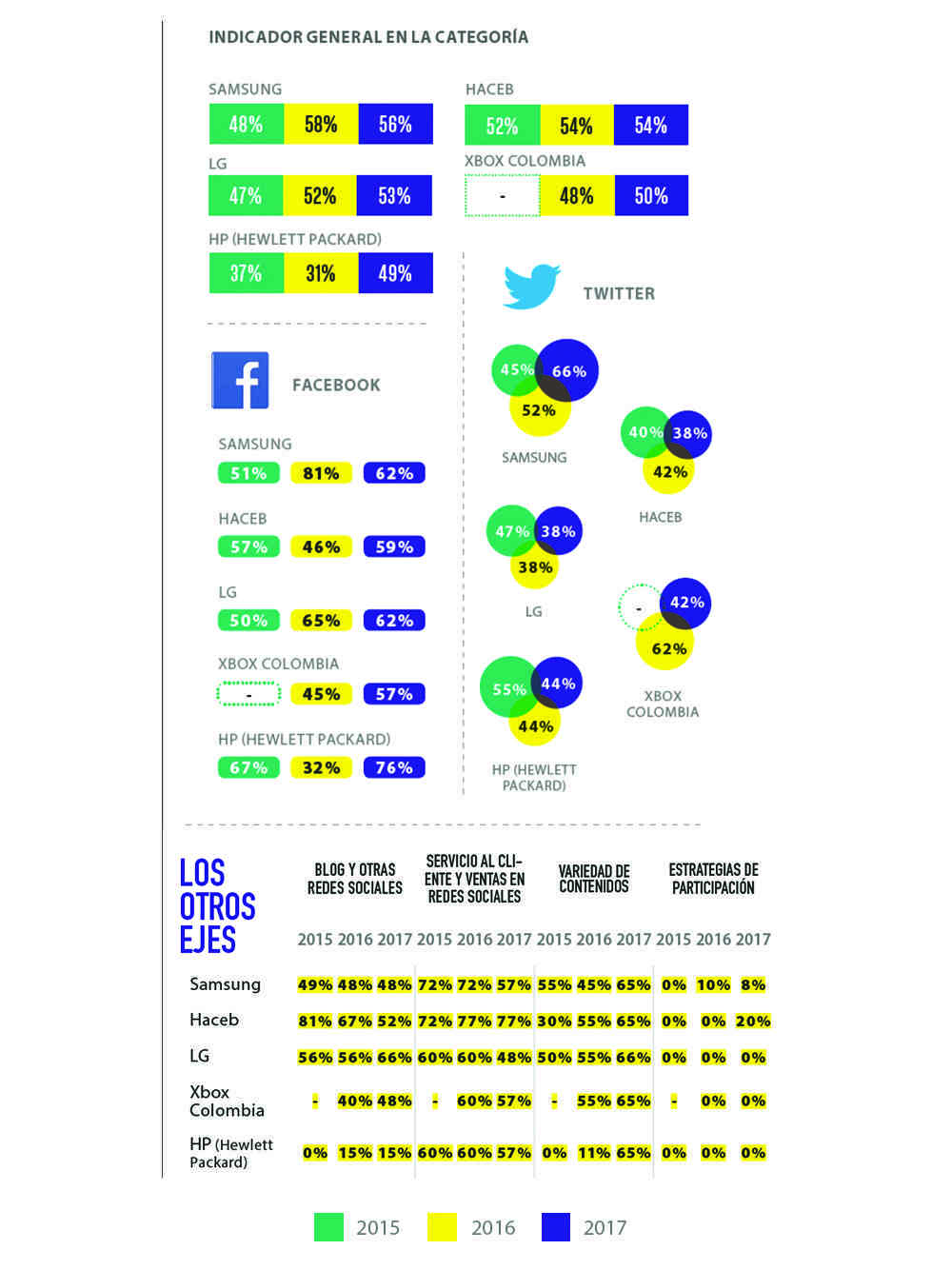 Esta fue una categoría que este año no tuvo cambios frente a 2016. Samsung se mantuvo al frente, con 56%, aunque perdió dos puntos porcentuales y Haceb conservó su porcentaje de 54%. En Twitter, Samsung crece 14 puntos porcentuales, llega a 66% y es el primero en esta red social, mientras en Facebook pierde 19 puntos y se ubica en 62%. Haceb, por su parte, muestra su mejor indicador en servicio al cliente y venta en redes sociales, con 77% –el mismo porcentaje de 2016– y en variedad de contenidos con 65%. El crecimiento más alto lo tuvo HP (Hewlett Packard) que pasó de 31%, en 2016, a 49% este año, y fue el más alto en Facebook con 76%. En variedad de contenidos se destacó LG, con 66% .