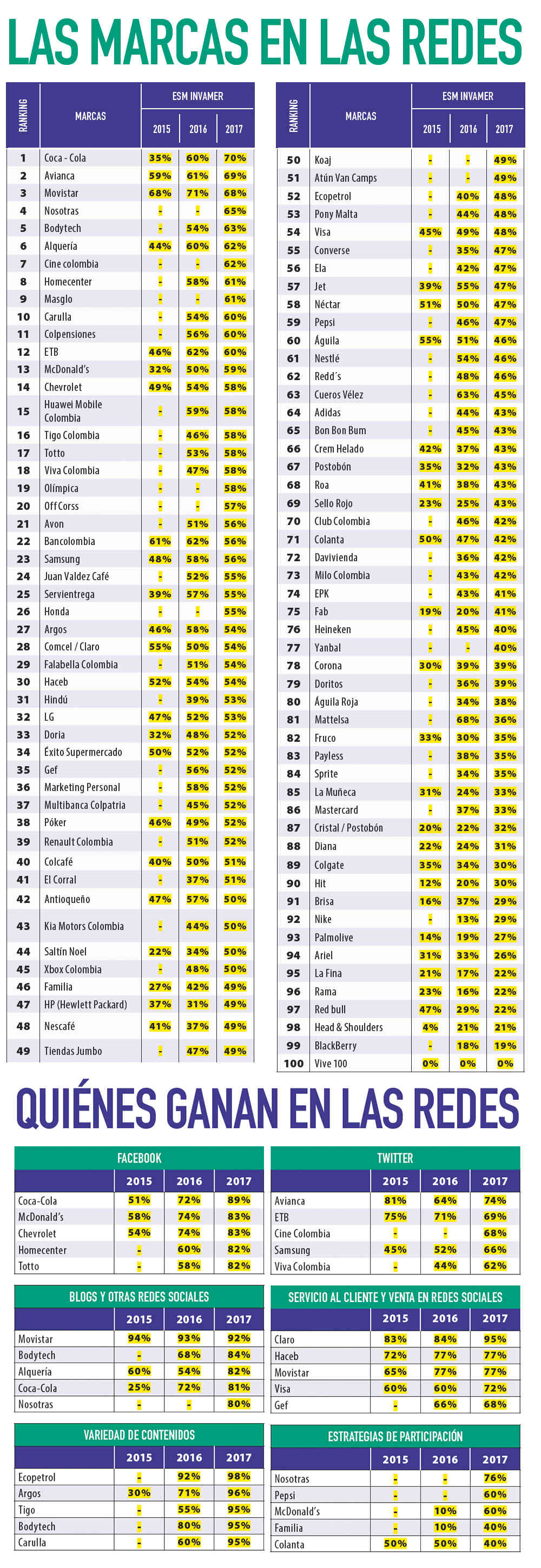 En Facebook, dos hechos enmarcan los resultados: el primero, que el promedio viene en ascenso y llegó a 58%, de 52% que había registrado en 2016; y el segundo, que los 5 primeros lugares los ocupan marcas distintas a las del año pasado. Avianca, Mattelsa, Huawei, Samsung y Cueros Vélez, cedieron sus puestos a Coca-Cola, McDonald’s, Chevrolet, Homecenter y Totto.