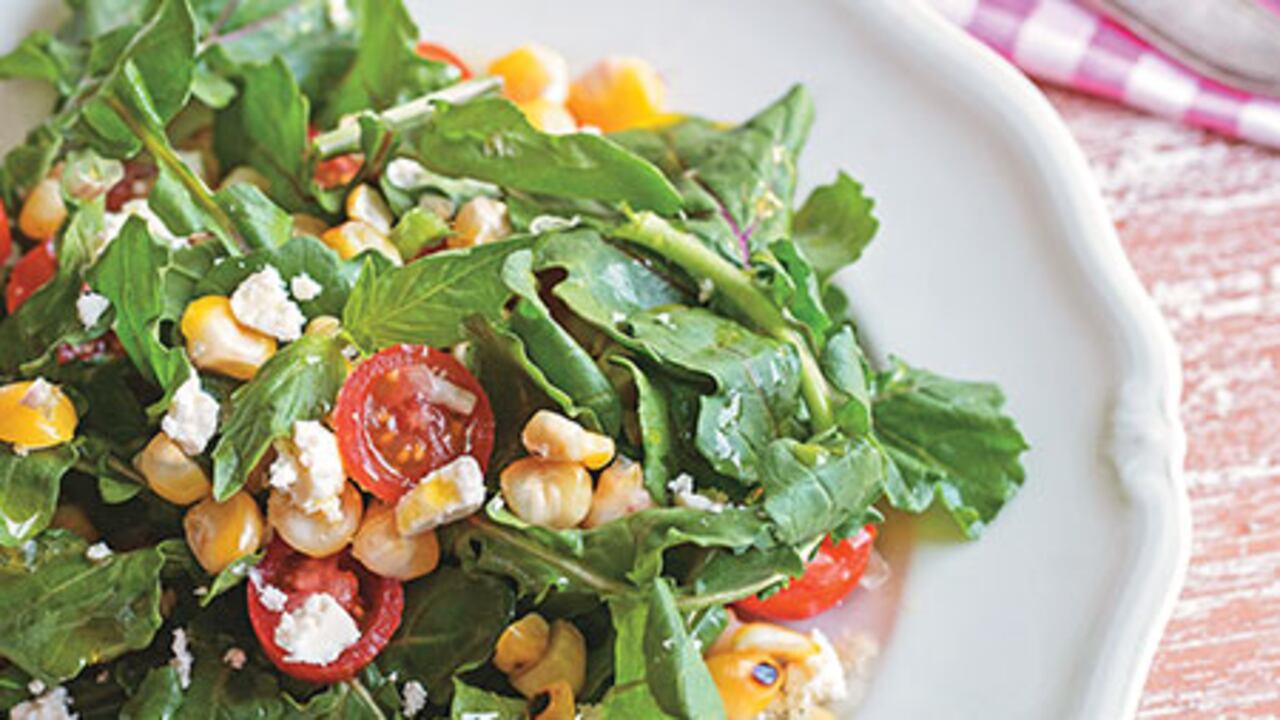 Unte con aceite de oliva las mazorcas. En una parrilla o plancha áselas por todos los lados hasta que estén tiernas y tengan un poco de color. Mientras tanto, prepare la vinagreta, mezclando todos los ingredientes y ajustando la sazón con sal al gusto. Con la ayuda de un cuchillo, desgrane las mazorcas y descarte las tusas. En un tazón, mezcle los granos de mazorca con los tomates cherry. Sazone con la vinagreta y reserve por 10 minutos.