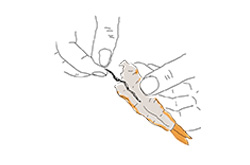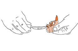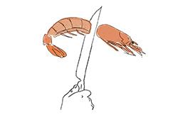 Haga un corte que separe la cabeza de la cola. Inserte un cuchillo en el vientre para apartar el caparazón de la cola. Busque el tubo digestivo –un filamento oscuro– y retírelo.
