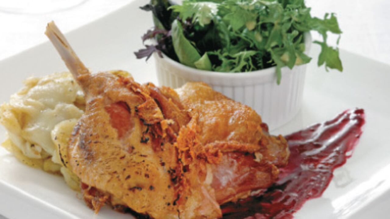 Luego, sumerja por completo las presas dentro de la grasa con el lado de la piel por debajo. Lleve al horno a temperatura baja entre dos y tres horas aproximadamente. Notará que el pato ya está listo cuando pueda ver el hueso. Retírelo de la olla y ubíquelo en otro recipiente, cuele la grasa que usó y cubra de nuevo las presas con esta hasta que estén sumergidos. Deje enfriar y lleve a la nevera.