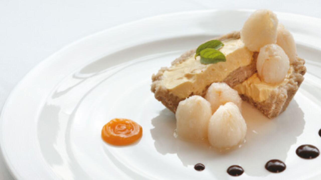 Vierta la preparación sobre los moldes previamente listos con la masa y congele durante mínimo una hora. Decore con los lychees.