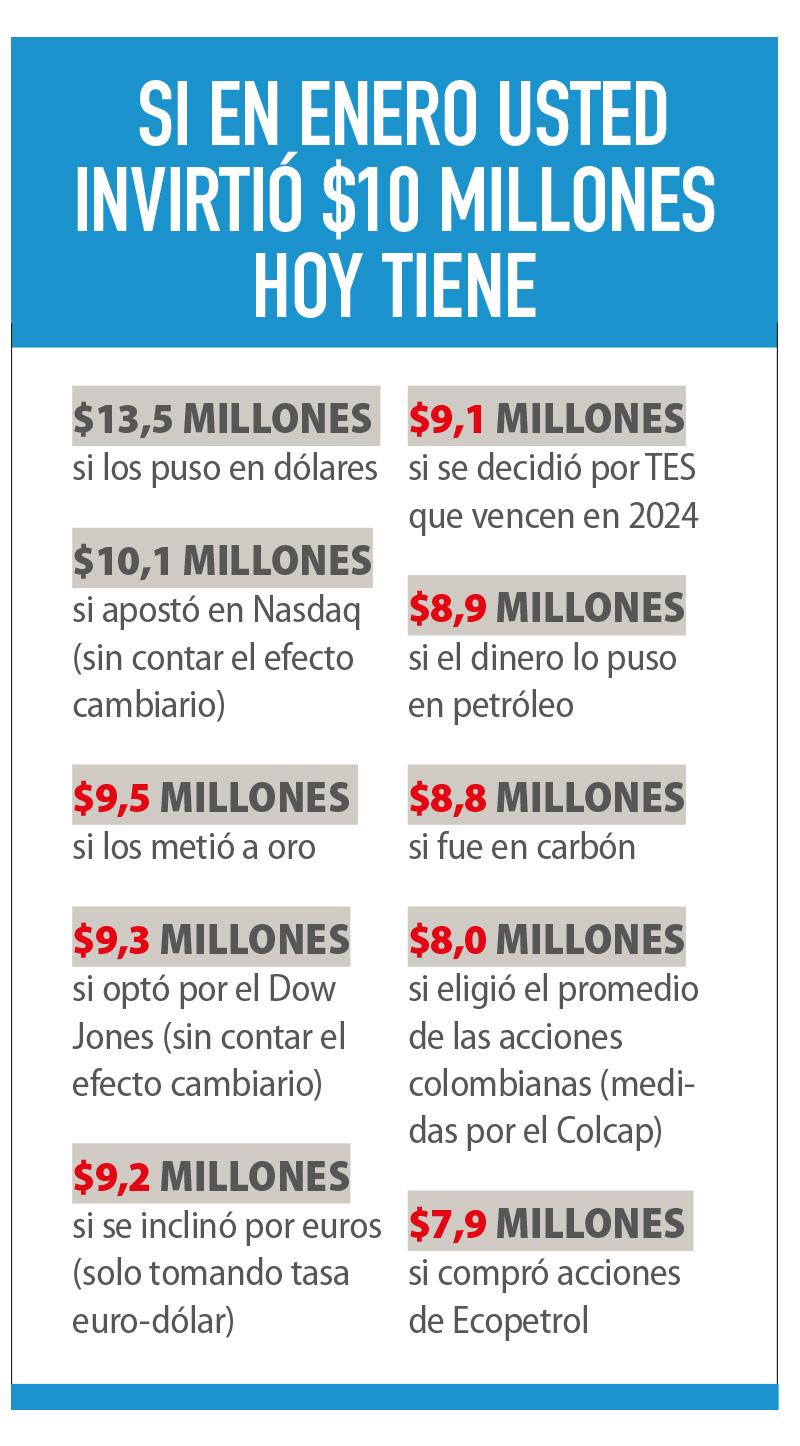 La acción de Sura, por ejemplo, ha perdido 12% de su valor este año, mientras que Cementos Argos ha descendido 6,94%, pese a que ambas no solo dependen de su operación en Colombia sino que tienen una fuerte presencia externa.No obstante, para que la bolsa nacional vuelva a ser atractiva se requiere que se detenga el alza de la tasa de cambio y, si no desciende, al menos que no suba más, puesto que los dólares compiten con las acciones como alternativa de inversión.