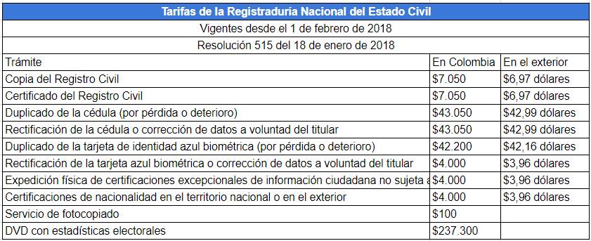 El aumento de las tarifas del 4,09% se realiza de acuerdo con el índice de inflación para la vigencia 2017, de acuerdo con el Departamento Administrativo Nacional de Estadísticas (Dane). El Comité de Tarifas de la Registraduría Nacional del Estado Civil estableció que el costo a partir del 1 de febrero de 2018 de los duplicados y rectificaciones de la cédula de ciudadanía, es de $43.050. Para los colombianos que adelanten el trámite en los consulados en el exterior el valor es de $42,99 dólares.