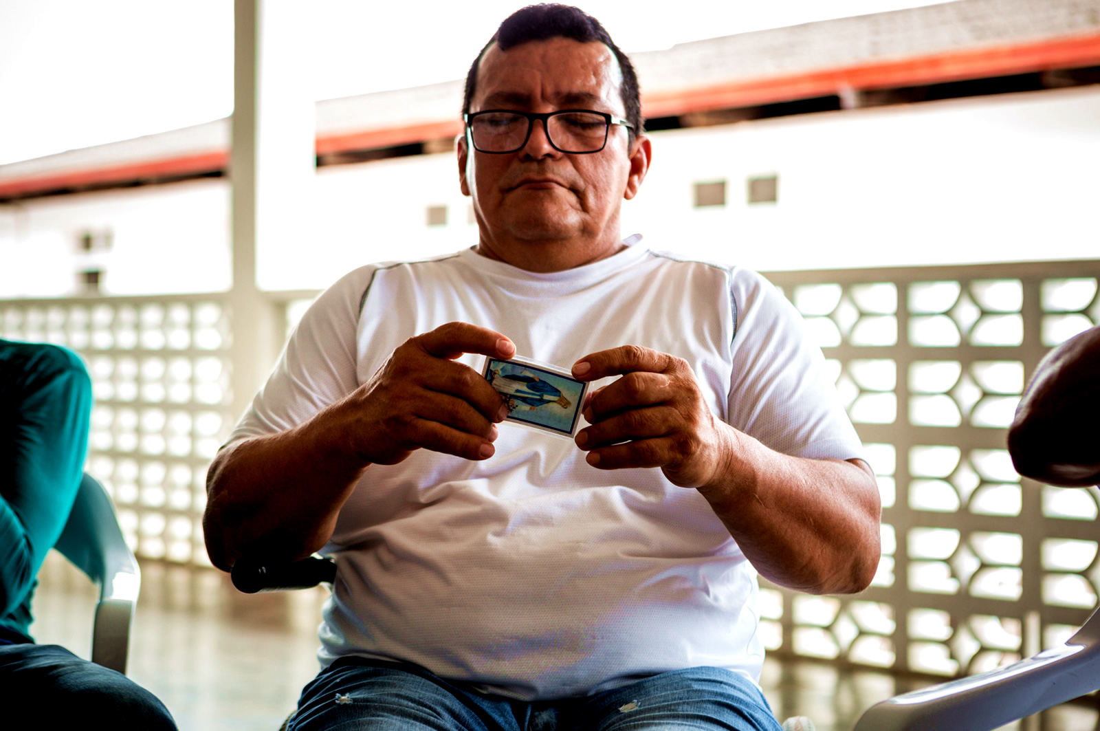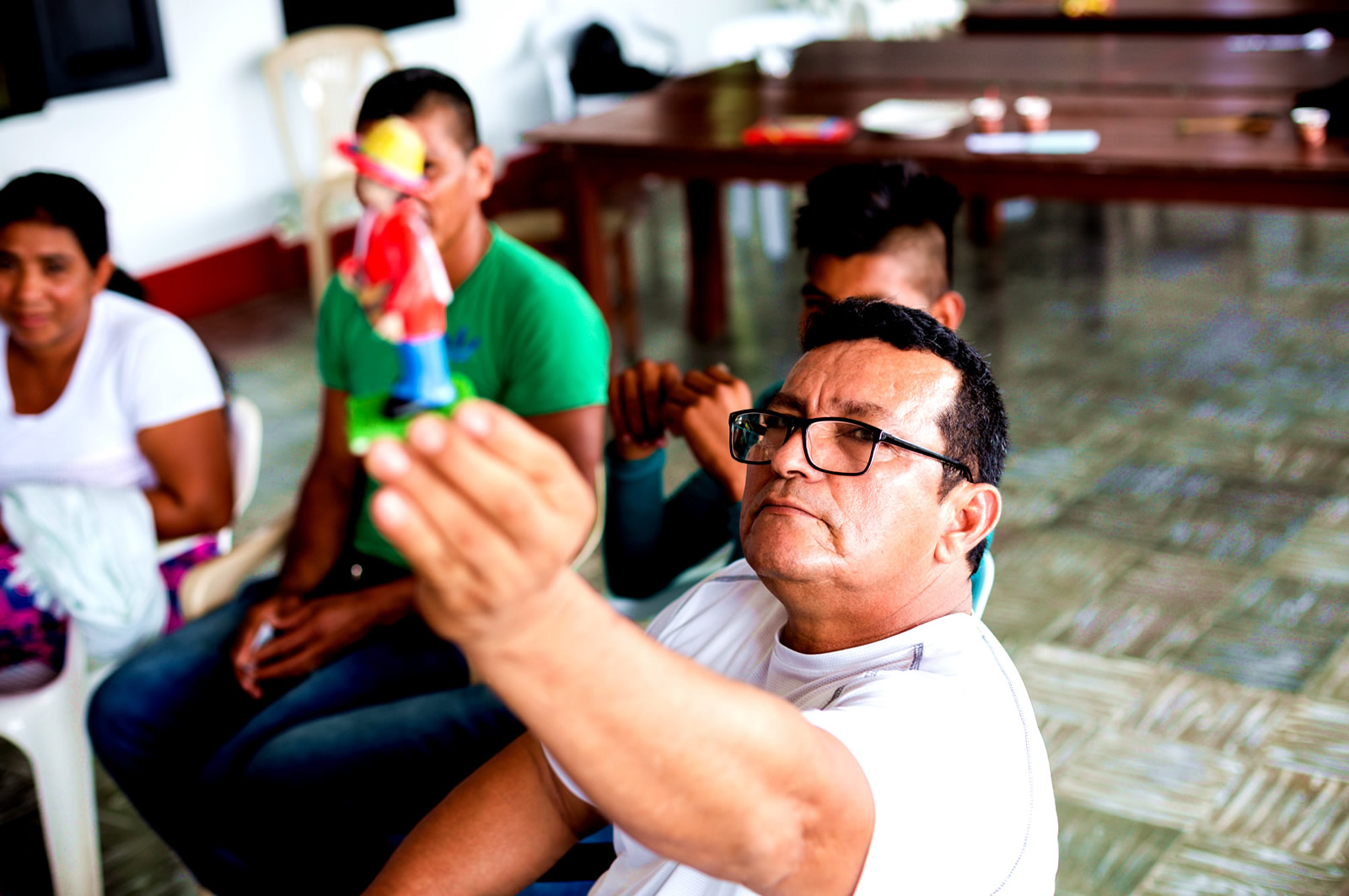 “Este ejercicio encaja para todo lo que se ha vivido en el conflicto. Desde el desplazamiento hasta los accidentes con minas, todo hay que remediarlo y sanarlo”, dice José Numael, que salió desplazado del caserío de Peñas Coloradas, en el bajo río Caguán, en 2004. “El hecho de que yo esté así es el reflejo de que desafortunadamente se perdieron las piernas, pero no la cabeza. Me restauraron y aún sé que hay José para rato”.
