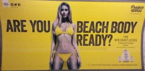 La marca británica ‘Protein World’ que vende suplementos alimenticios para ayudar a formar los músculos de quienes asisten al gimnasio, cometió un error al presentar una campaña en la que se ve a una mujer atlética vistiendo un bikini con un epígrafe que dice “Está listo tu cuerpo para la playa”. Los anuncios, que fueron puestos en las redes de trenes en Londres, desataron una gran polémica porque se consideró una campaña sexista que dio a entender que solo las mujeres con el cuerpo de la chica de la imagen podían ir a la playa.