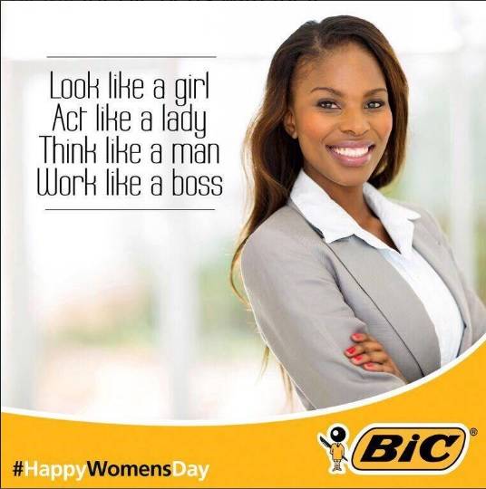 La famosa marca francesa de lapiceros Bic quiso celebrar el día de la mujer mandando un mensaje especial, pero en su lugar hizo una infortunada campaña que solo promovía la desigualdad de género. Pues arriba de un banner de la marca y del hashtag #Happywomensday aparece una mujer sonriente al lado de un letrero que dice “luce como una mujer, actúa como una dama, piensa como un hombre y trabaja como un jefe”.
