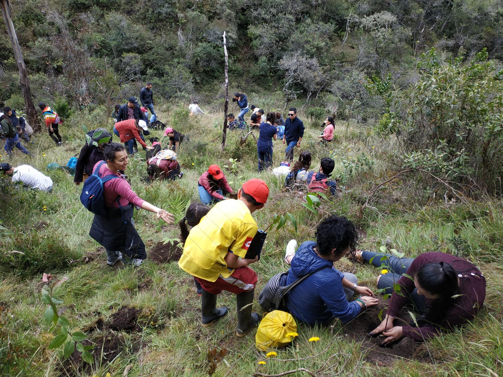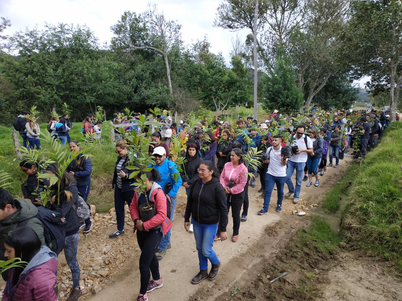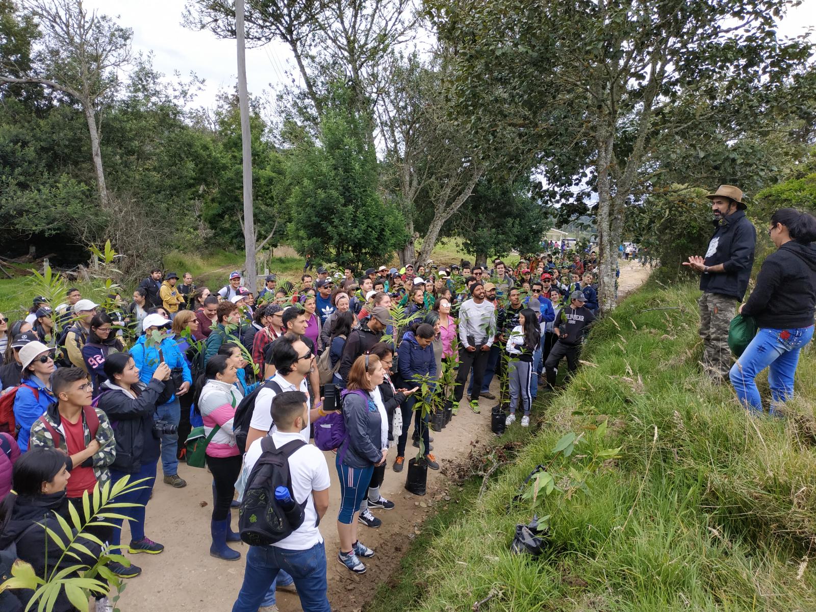 Ciudadanos verdes El pasado 5 de octubre, más de 300 personas llegaron a las 6 de la mañana al centro comercial los Héroes en Bogotá, donde diez buses los conducirían hasta la represa del Sisga, ubicada en el municipio de Chocontá. Allí sembrarían los 1.000 árboles nativos del Parque Chicaque que corrían el riesgo de morir por la ausencia del vivero. “Llegamos juntas a la cita. Gabriela aún no sabía de qué se trataba la actividad, pero estaba contenta y ansiosa. Cuando vio a toda la gente con palas y guantes le revelé la verdad: seríamos parte de esta campaña para salvar los árboles de Chicaque. Ella me abrazó y con lágrimas en sus ojos me dijo: es el mejor regalo que he recibido mamá. Se nota que me conoces perfectamente”, asegura Marcela. Luego de un viaje de casi dos horas, los centenares de participantes llegaron a un predio privado de la vereda Tilatá Alta listos para sembrar. Un camino destapado los condujo a una parte montañosa, que en el pasado fue afectada por la ganadería y los cultivos de papa y cebolla. Todos marcharon cargando los árboles de especies como chuguaca, roble, matabuey, palma caña víbora, arrayán, gomo, lechero, gaque, huesillo blanco y mortiño.