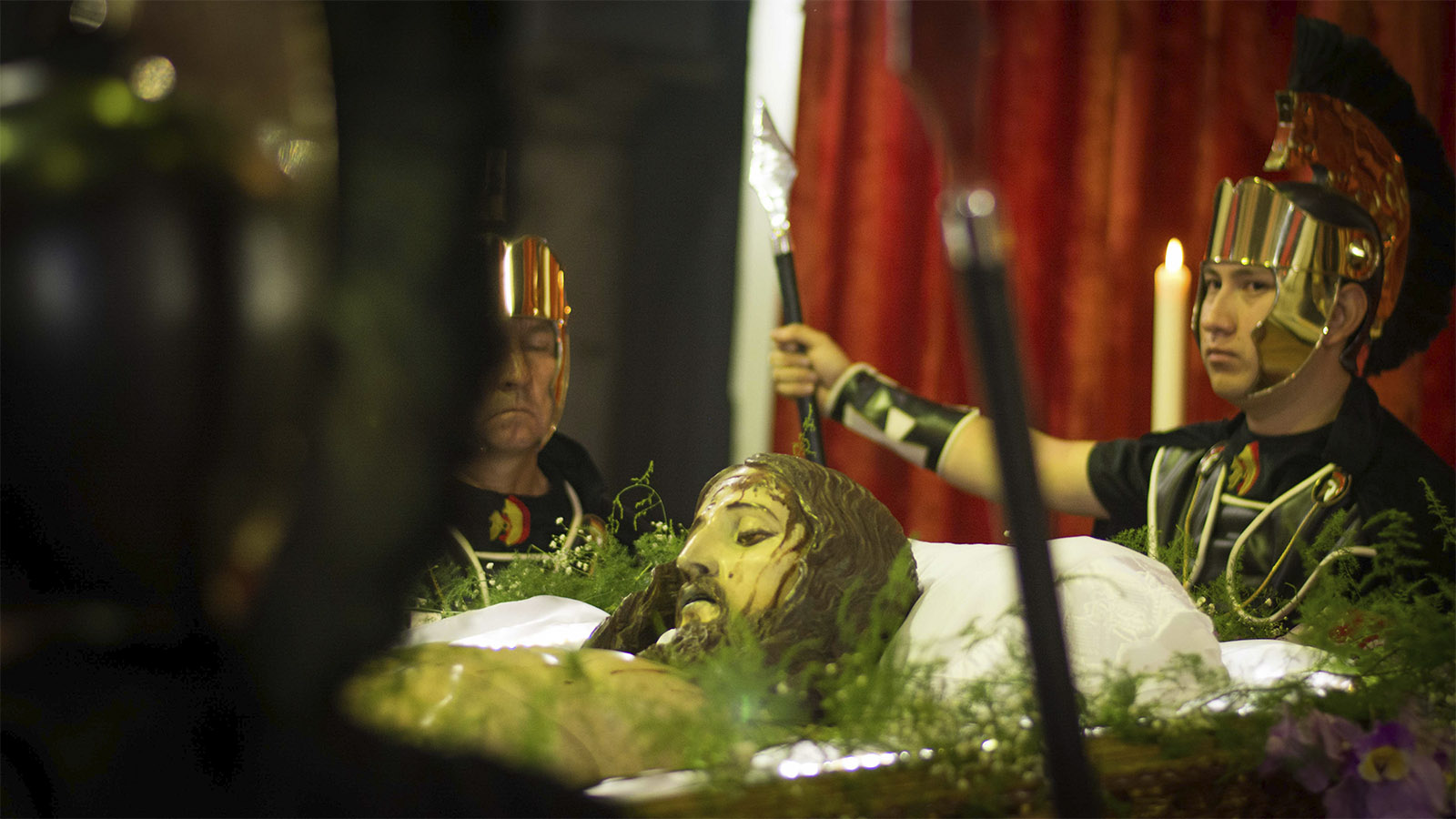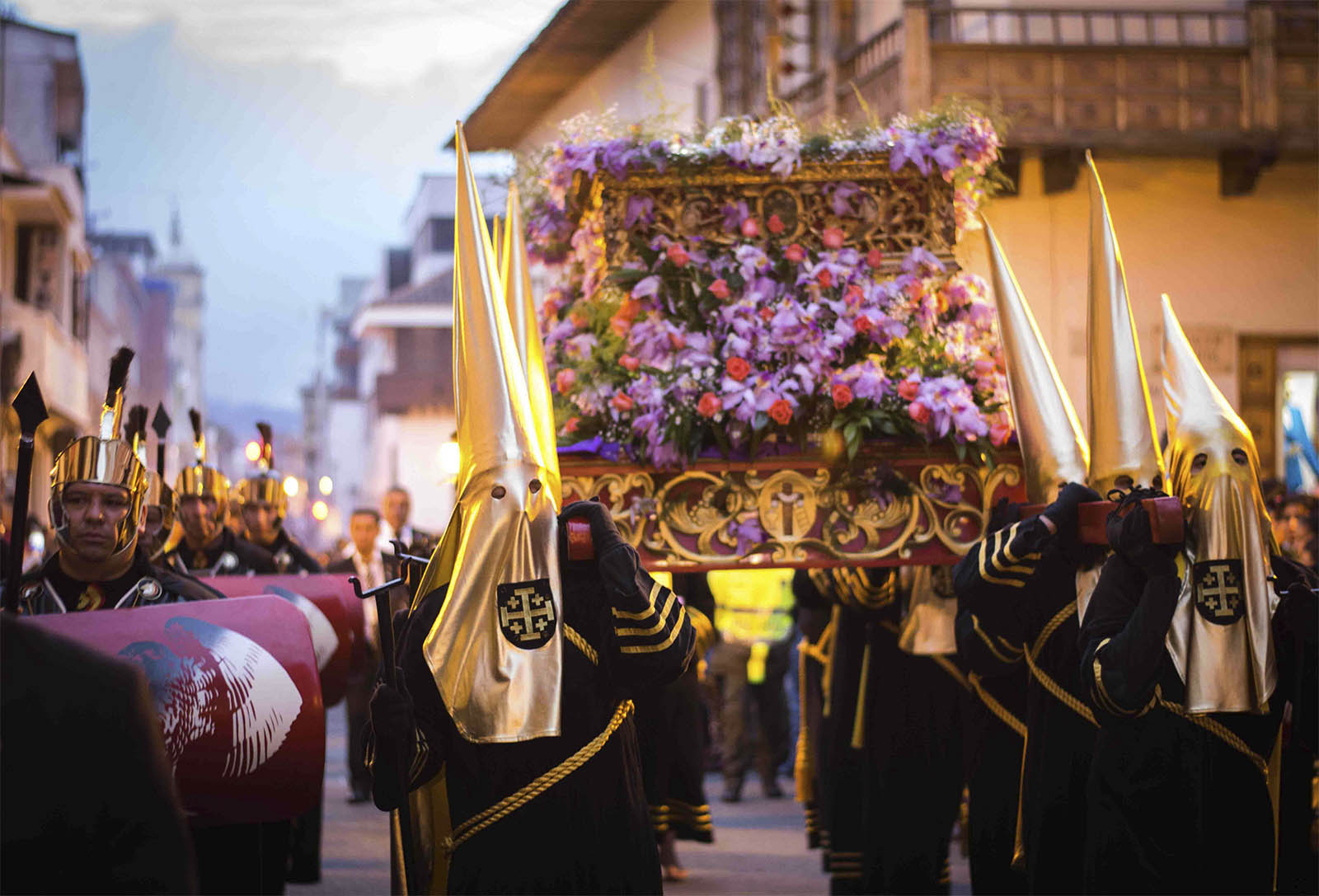 Cerca de 400 hombres y mujeres –conocidos como nazarenos o penitentes– hacen fila a lo largo de las calles de la ciudad cargando en sus hombros el peso de esculturas de tamaño real que recrean los pasos del viacrucis y otros fragmentos o personajes bíblicos. Se alistan para emprender una procesión que tarda cerca de dos horas, y recorre las manzanas aledañas a la Plaza de Bolívar.