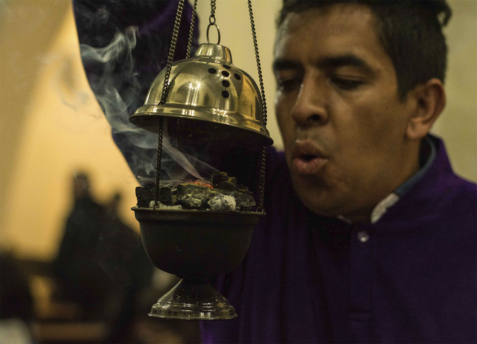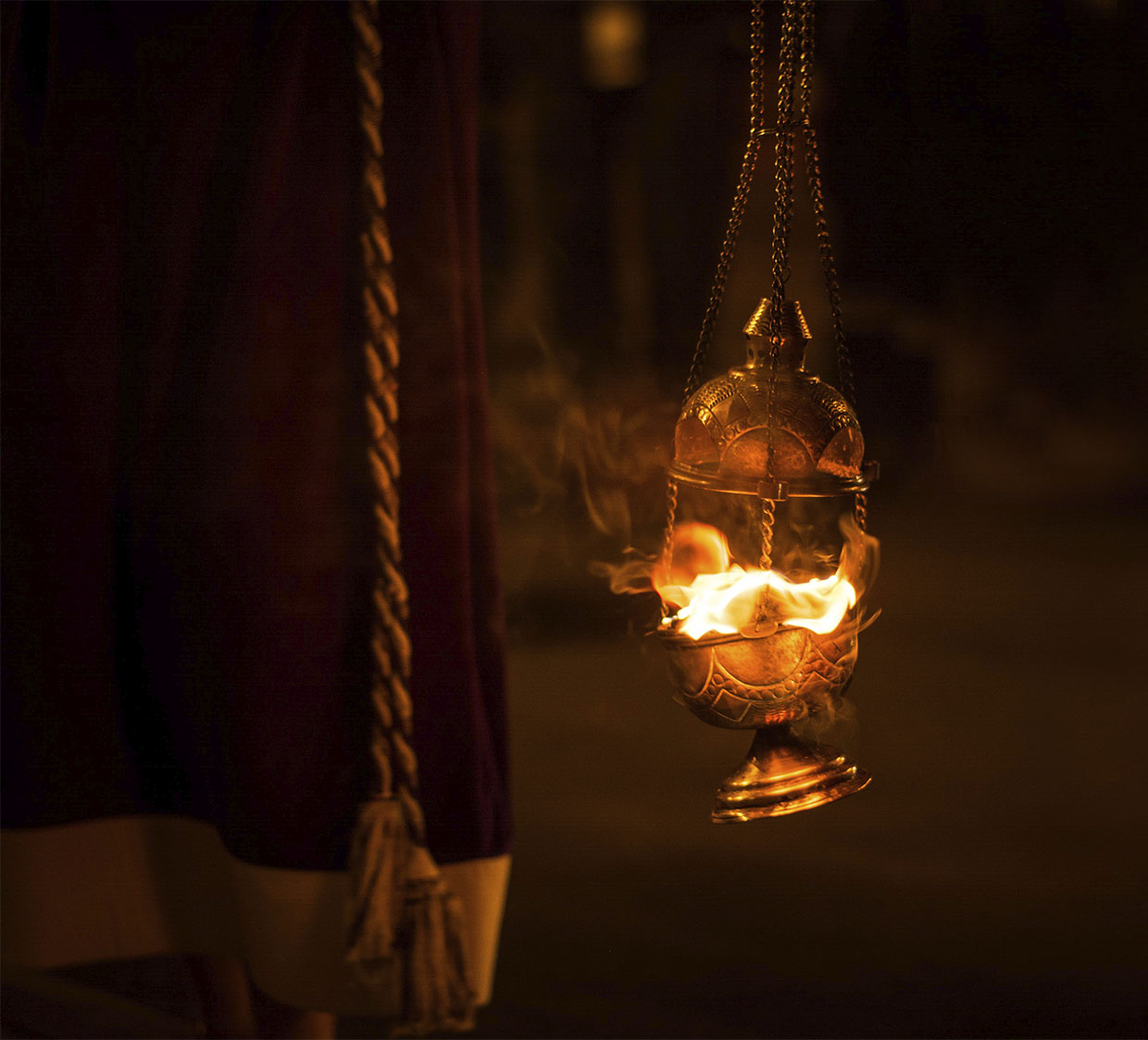 Antes de comenzar la marcha, el carbón se introduce en los incensarios y, alentado por los soplidos del jefe de paso –que va a la cabeza de su grupo, cargando el estandarte–, comienza a aparecer aquel humo gris que se diluye por las calles, y penetra el ambiente con su característico olor. De fondo, suenan los bombos y las liras de la Banda heráldica de la Primera Brigada de la Policía Militar, que acompaña la procesión de principio a fin.