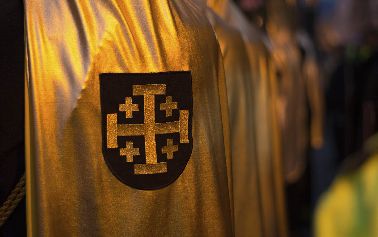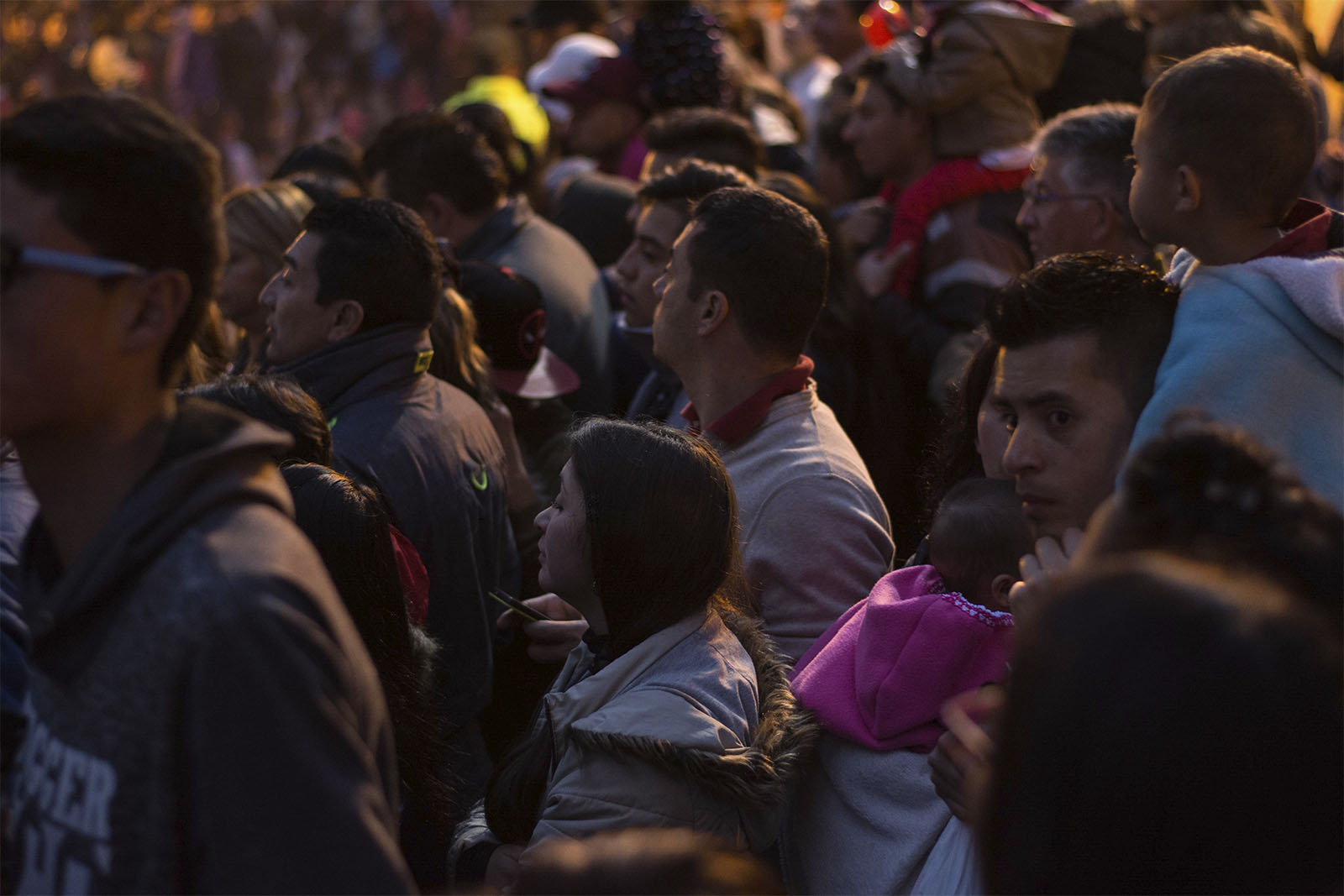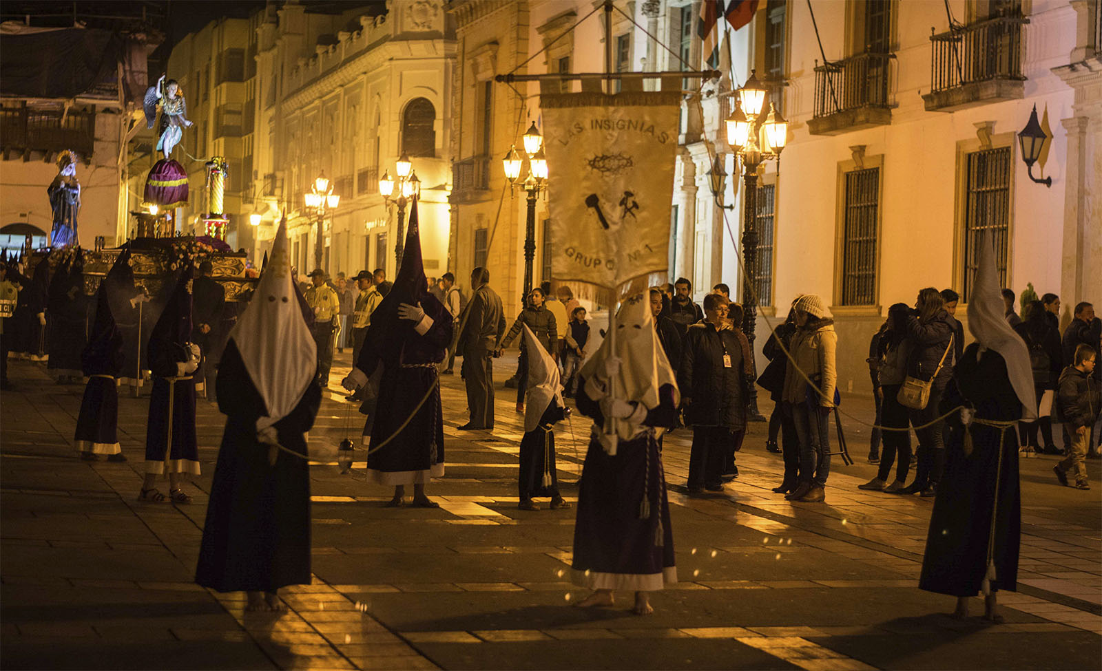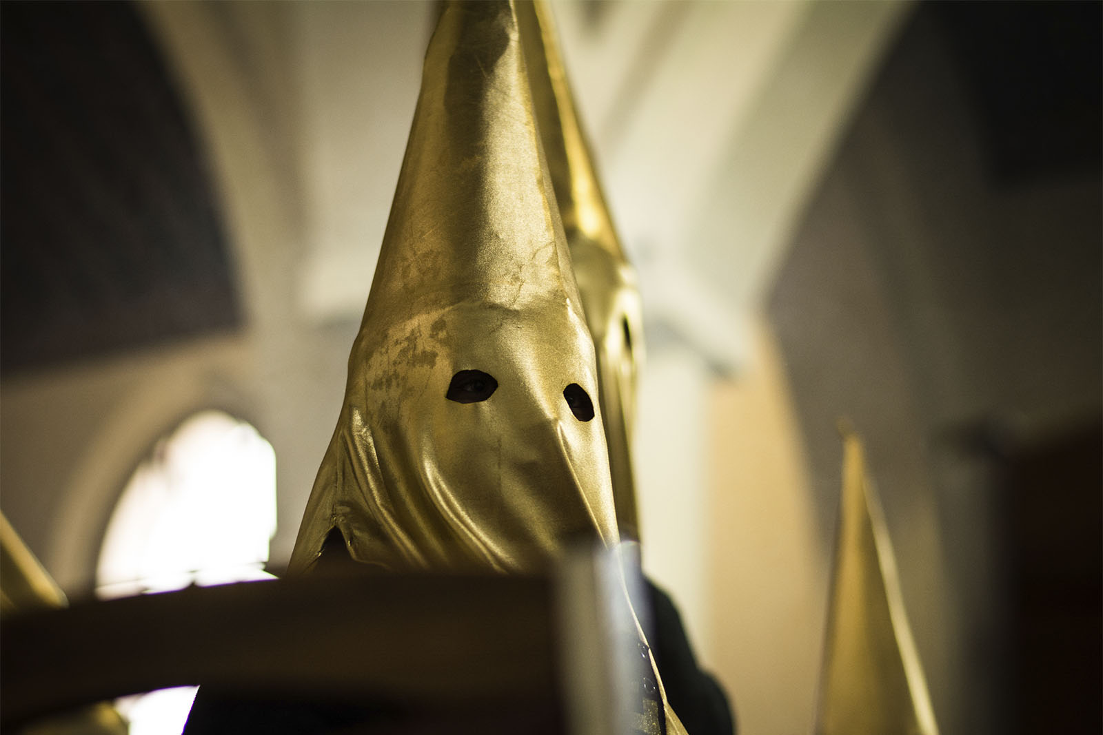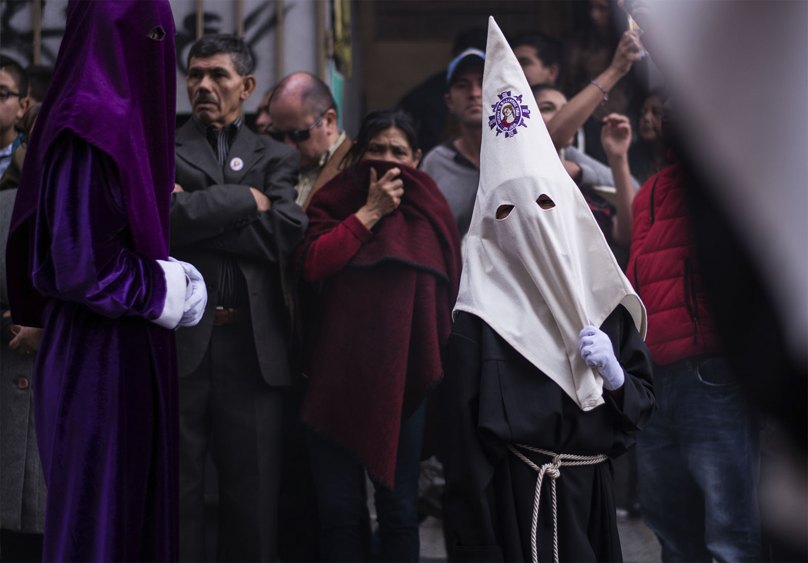 La acera no solo separa al público expectante de los nazarenos, sino que también marca la frontera entre la escena inquisidora y la moderna. Por las calles solo se observan túnicas largas de distintos colores y bordados, capirotes [sombreros altos con forma de cono] de un sinnúmero de tamaños, cíngulos [cordones que sirven de cinturón] y bastones. El paisaje solo se ve interrumpido por los uniformes verdes de los policías que manchan de forma llamativa el desfile.