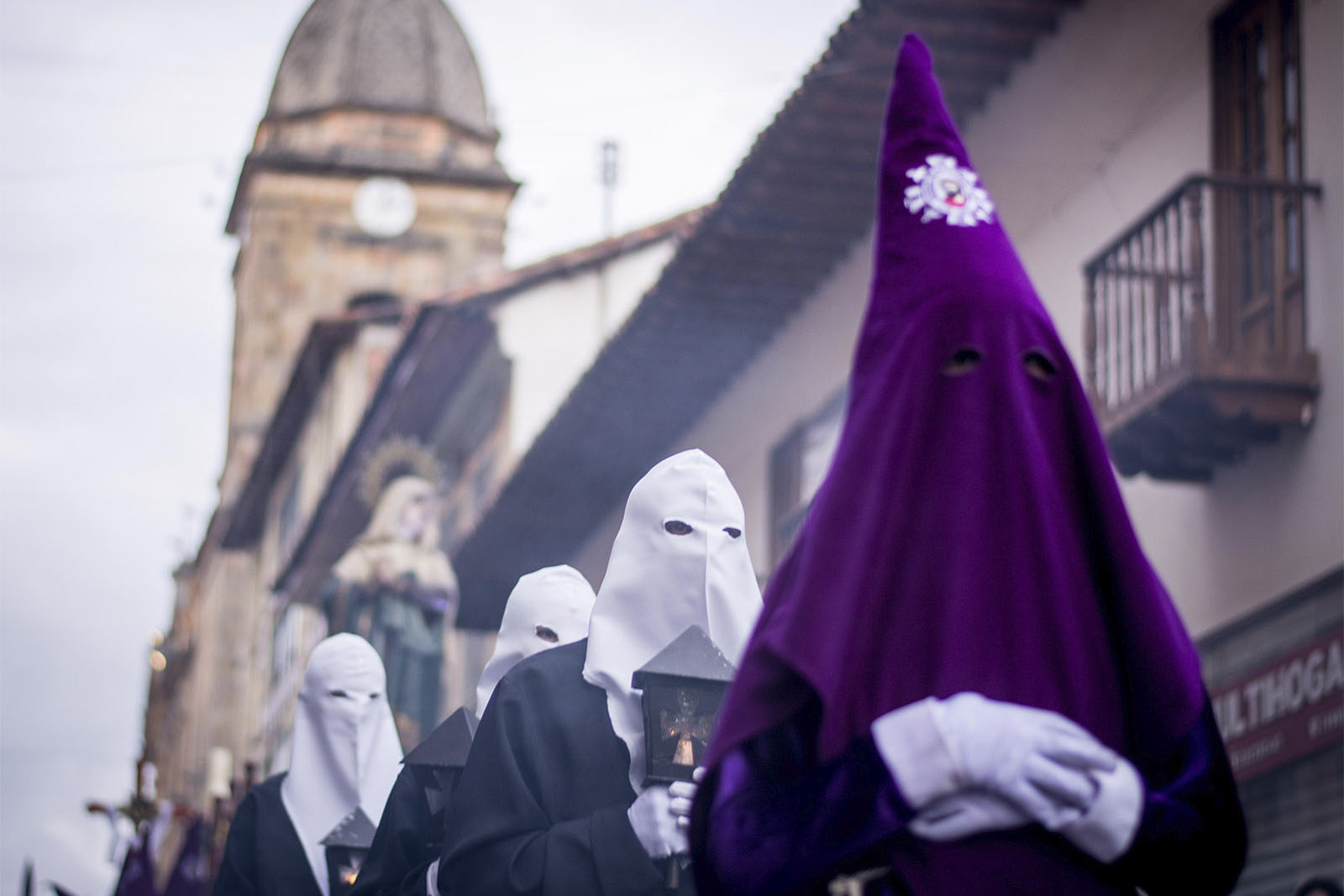Las estrechas calles del centro histórico de Tunja se inundan con el humo del incienso durante el Viernes Santo. Mientras los andenes soportan el peso de una multitud expectante, el asfalto le cede su espacio a decenas de pies descalzos que apenas se alcanzan a ver bajo túnicas largas y gorros puntiagudos. La escena parece sacada de uno de los lienzos de la Inquisición pintados por Goya.
