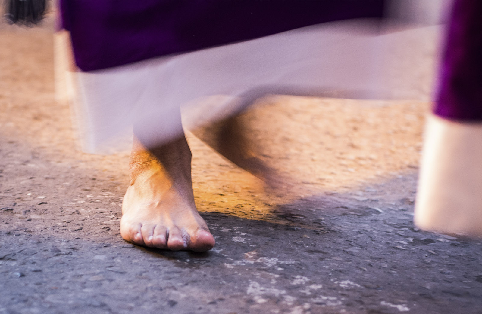 El desfile está por arrancar. Los pasos procesionales, como se le conoce a las gigantes esculturas, se muestran imponentes ante los ojos de feligreses, turistas y curiosos que se aglomeran en los andenes. Pasadas las cinco de la tarde, los pies descalzos comienzan a moverse sobre el pavimento.