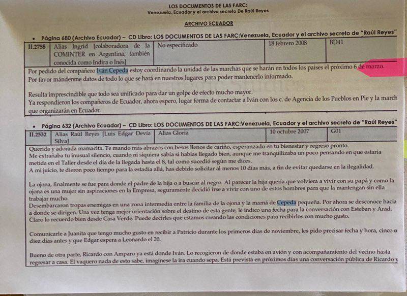 El expresidente recordó que Cepeda, según él, ha sido amigo cercano de Iván Márquez y de Jesús Santrich, prófugos de la justicia, y que hay correos que así lo demuestran. Por esa razón, Uribe leyó uno de esos escritos que estaban en el computador de Reyes.