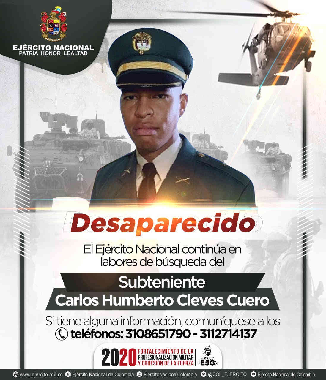 Frente a las informaciones sobre la presunta desaparición del Señor Subteniente Carlos Humberto Cleves Cuero, el comando de la Unidad se permite informar que: 👇🏻 pic.twitter.com/6iv6ko9IC0