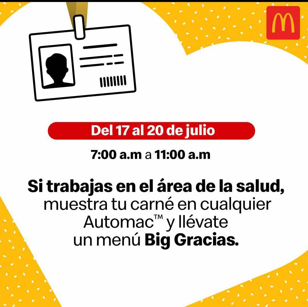 ¿Es médico? ¿enfermero(a)? ¿Trabaja en el sectorde la salud? Si es así, desde mañana 18 de julio hasta el lunes festivo 20 de julio podrá pasar por cualquier restaurante de la franquicia multinacional McDonald’s y reclamar gratis un combo de desayuno "Big Gracias", una iniciativa del gigante de la comida rápida para dar estímulo y aliento a quienes día tras día luchan para combatir la pandemia de la covid-19.