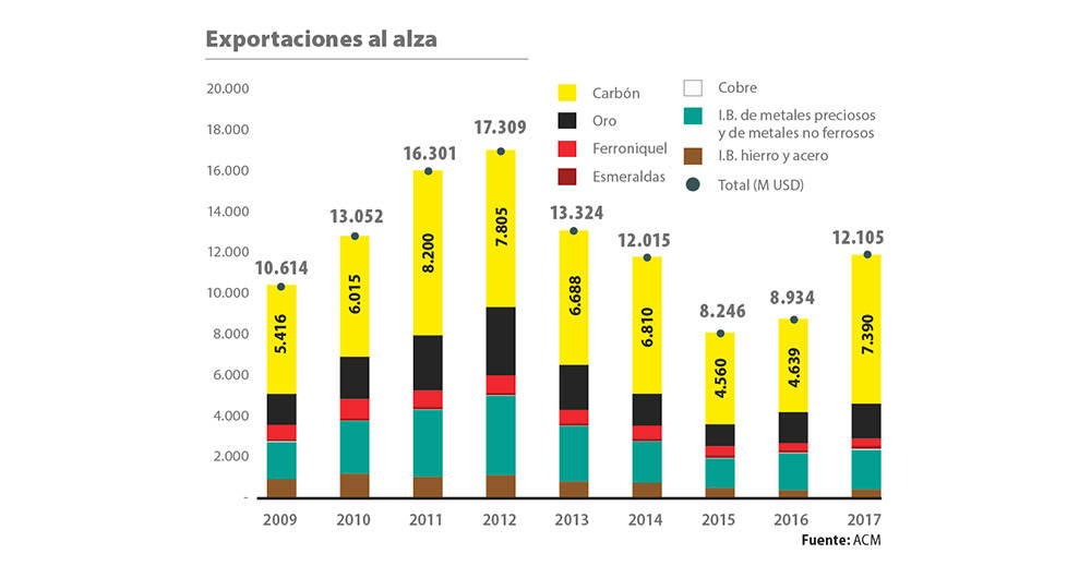 La situación no fue exclusiva del carbón. Lo mismo pasó con el cobre, la plata, el níquel y el mineral de hierro. El reflejo de esta recuperación se dio en dos cifras: por un lado, las exportaciones que crecieron 35% frente a 2016, al superar los US$12.000 millones, de los cuales cerca de US$7.400 millones fueron de carbón.