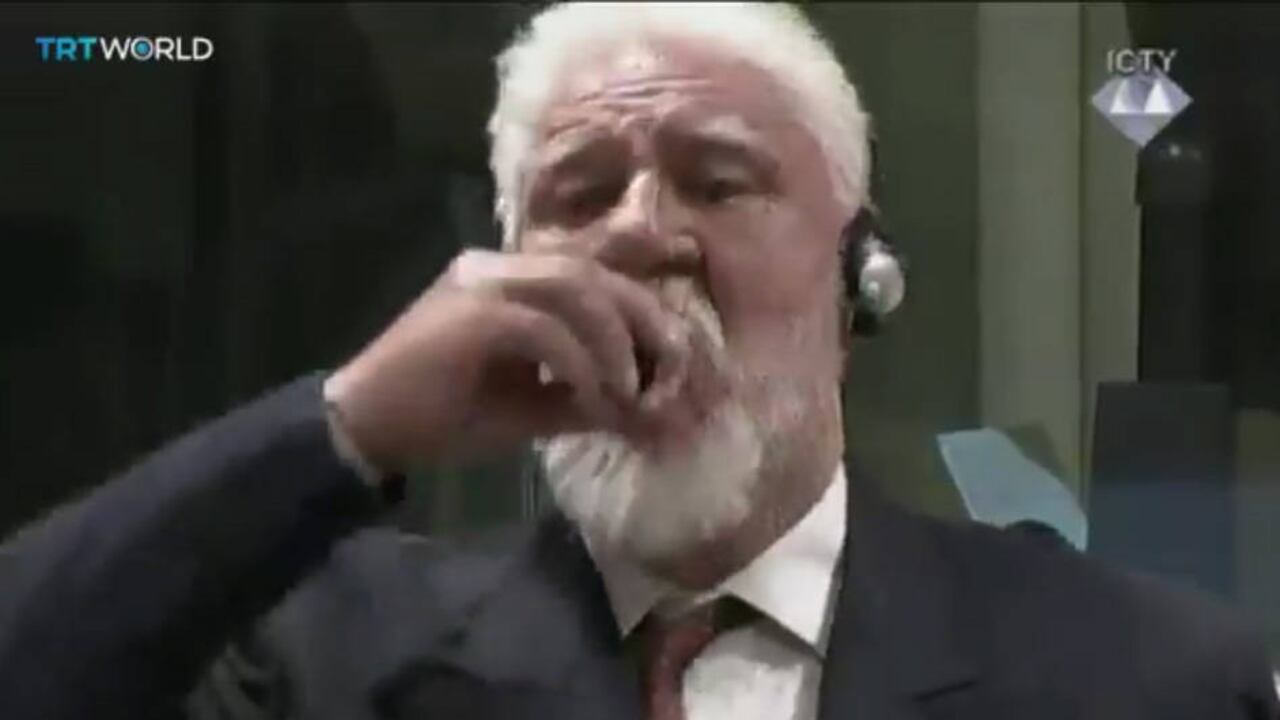 El excomandante bosnio croata Slobodan Praljak se paró y bebió lo que describió como veneno luego de escuchar el veredicto de la corte.