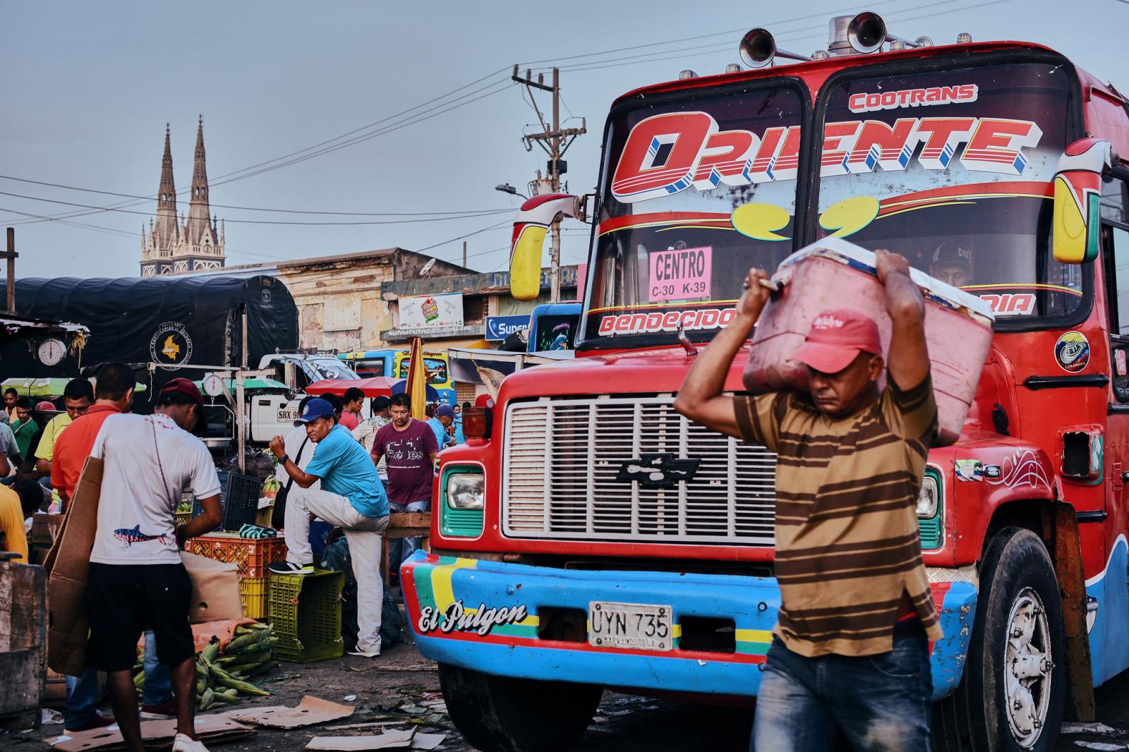 Lleva zapatos rojos como la sangre que se riega en los mesones de las carnicerías a tan solo unos cuantos puestos. Un rojo como el que tendrá el sol cuando se alce entre la bruma de un río Magdalena podrido. En un rato comenzara a clarear y vendrá el unísono del canto de los gallos, loros, canarios y otras aves que, como muchas cosas aquí, se venden venden vivas o muertas.