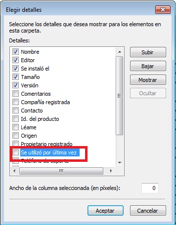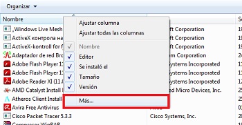 4. Si quiere ver qué programas NO ha utilizado en el último tiempo, ponga el cursor en la opción “Nombre”, haga clic izquierdo y seleccione la opción “Más”, como se ve en la imagen: