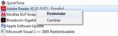 7. Usted puede seleccionar el programa que considere que no necesita y desintalarlo. Simplemente haga clic izquierdo sobre el programa y seleccione la opción “Desinstalar”: