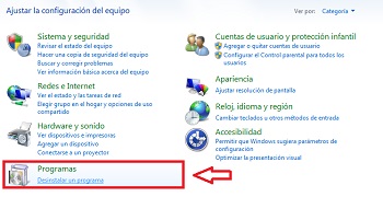 2. En la nueva ventana seleccione la opción “Programas” y e indique el botón “Desinstalar un programa”: