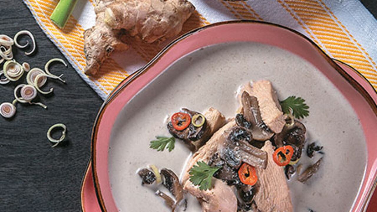 Caliente el caldo y cocine las pechugas cortadas en trozos, añada la salsa de pescado, la rama de cilantro, el jengibre, la cáscara de limón, la limonaria en tajadas y el tallo restante.