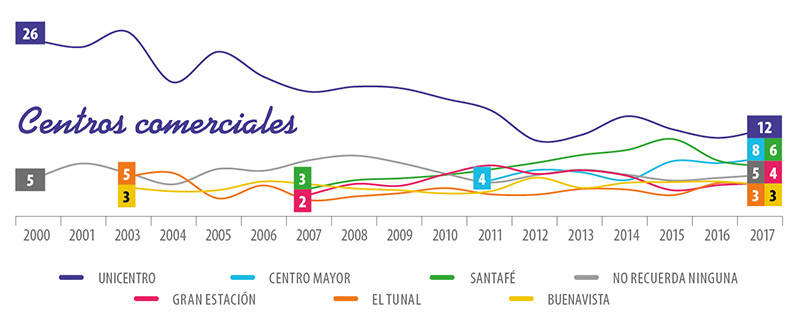 En una categoría caracterizada por jugadores locales y gran atomización, Unicentro sigue como referente. Tras dos años de descenso, Unicentro revirtió la tendencia y llegó a 12% de top of mind. Gracias a su presencia regional, alcanza en Cali 21%, en Bogotá, 13%, y en Medellín, 8%, cuando la mayoría de las marcas solo obtiene puntajes en una ciudad. En los segmentos de mayores ingresos alcanza 28%, mientras en los mayores de 50 años registra 18%. Centro Mayor logra llegar al segundo lugar y desplaza a Santafé. Centro Mayor tiene en Bogotá 14%.