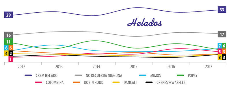 Con 33%, Crem Helado sigue al frente en la categoría de helados y para este año gana un punto porcentual frente a 2016. En Bogotá tiene su mayor top of mind entre las ciudades con 39%, seguido de Barranquilla con 29%. En los estratos de menores ingresos alcanza 36% y en los adultos entre 25 a 34 años registra 46%. El “no recuerda” tiene 17% y en los adultos de más de 50 años obtiene 27%.