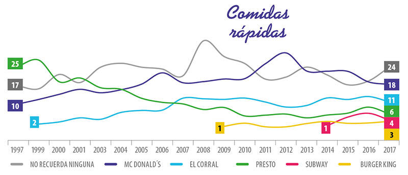 La tendencia del “no recuerda” sigue al alza en la categoría. Este año el “no recuerda” se despegó de McDonald’s y llegó a 24%, 5 puntos más que el año pasado. 38% de los mayores de 50 años no recuerdan ninguna marca, mientras que por ciudades el porcentaje más alto lo tiene Cali, con 38%. Las marcas líderes perdieron puntos: McDonald’s cayó 1; El Corral, 2; Presto, 3; y Subway, 2. McDonald’s es fuerte en Barranquilla, con 23% de top of mind, y entre los adultos de 18 a 24 años, donde alcanza 30%. Por su parte, El Corral en Bogotá tiene 19% y en los estratos de mayores ingresos alcanza 17%.