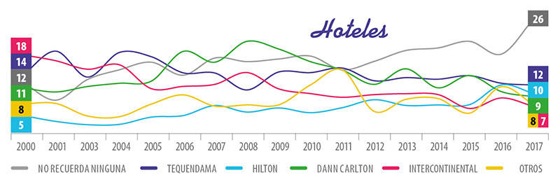El “no recuerda”, que el año pasado había cedido espacio, para este año se recupera –llega a 26%– y aumenta su distancia –14 puntos– frente a la primera marca de hoteles. “No recuerda” es la respuesta más común entre los encuestados, creciendo incluso 8 puntos porcentuales desde la medición anterior. Ninguno de los hoteles que han sido más mencionados en lo últimos años aumentó su top of mind y, por el contrario, disminuyeron o quedaron constantes. 40% de los adultos entre 18 y 24 años no recuerda ninguna marca. Tequendama es la primera marca que se destaca, con 12%, impulsada por Bogotá donde llega a 22%.