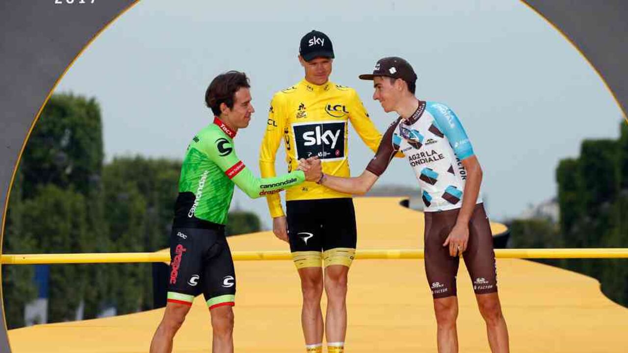 10:11 a.m. La champaña para Froome y el Sky. Segio Luis Henao hace parte de otro título del Tour.