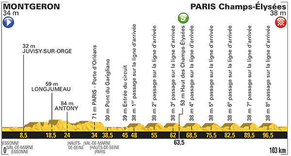 El icónico paseo triunfal en los Campos Eliseos entregará la victoria de etapa en un escenario inmejorable y certificará el segundo lugar de Rigoberto Urán en la ronda gala. El colombiano se inscribirá en letras doradas en la historia del ciclismo al conventirse en el tercer colombiano que ocupa un lugar en el podio del Tour de Francia.
