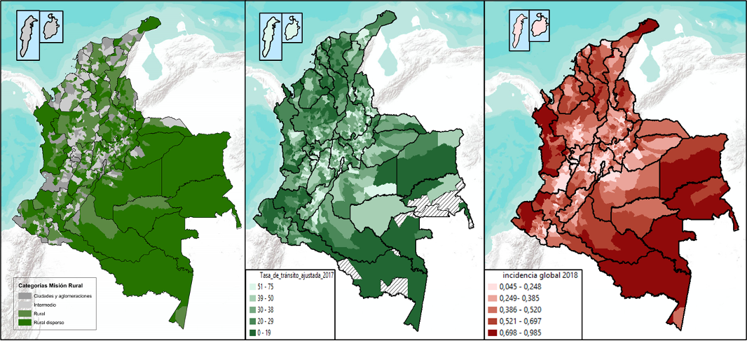 En la Ilustración 1 podemos ver una tendencia espacial entre los territorios del centro del país, donde se ubican gran parte de las ciudades y aglomeraciones y municipios intermedios. En ello se observan mayores tasas de tránsito según datos del Ministerio de Educación (2017) y menor incidencia de la pobreza multidimensional, de acuerdo con los datos del Censo Nacional de Población y Vivienda (2018).