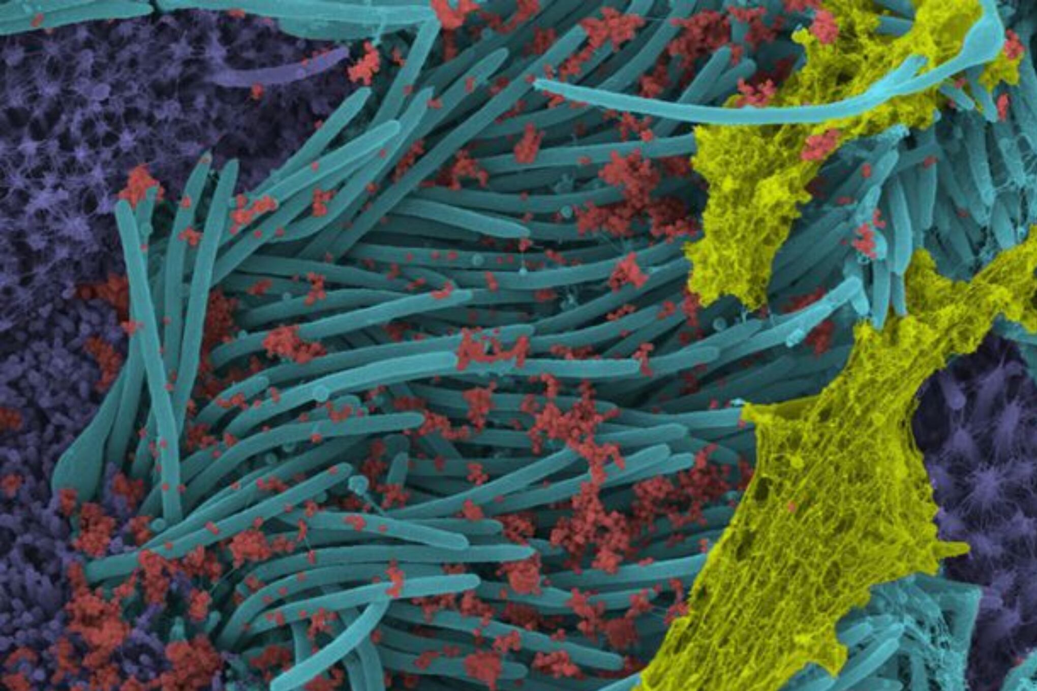 Foto: Universidad Carolina del NorteUna imagen de aumento de mayor potencia muestra la estructura y densidad de los viriones del Sars-CoV-2 (de color rojo) producidos por los epitelios de las vías respiratorias humanas. Los viriones son la forma infecciosa completa del virus liberado a las superficies respiratorias por las células huésped infectadas. Foto: Universidad Carolina del Norte.