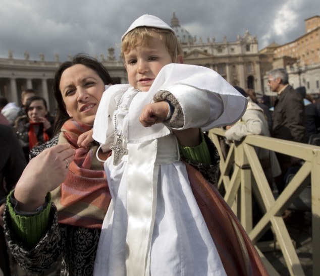 Daniele De Sanctis, un pequeño de 19 meses, llegó en brazos de su madre, Paola Ciabattini, vestido con la misma indumentaria del pontífice e incluso una diminuta cruz pectoral.
