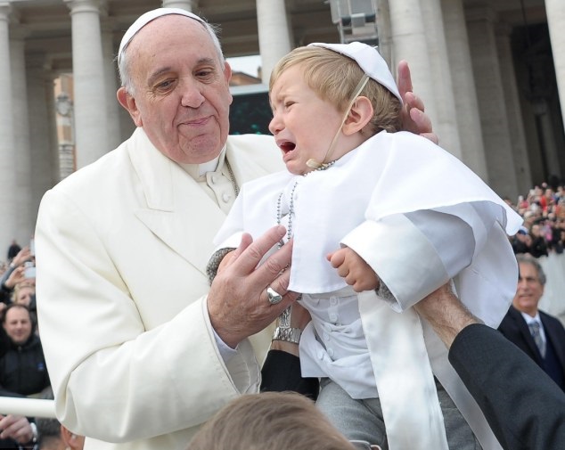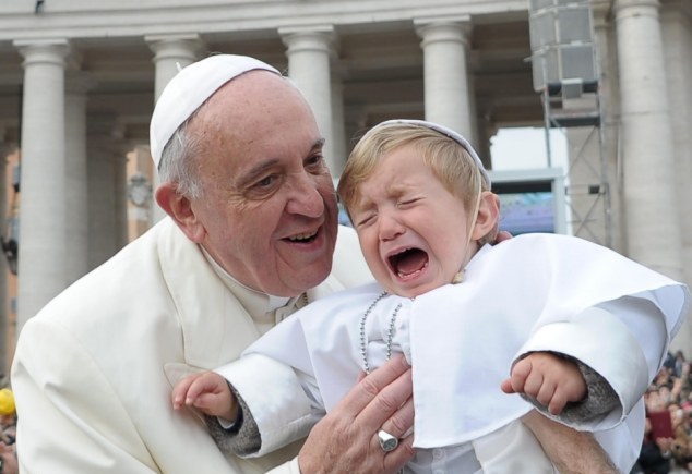 Daniele lloró cuando el papa lo alzó para darle un beso, pero después se vio feliz cuando la Guardia Suiza le permitió trasponer una sección vedada de la Plaza de San Pedro.