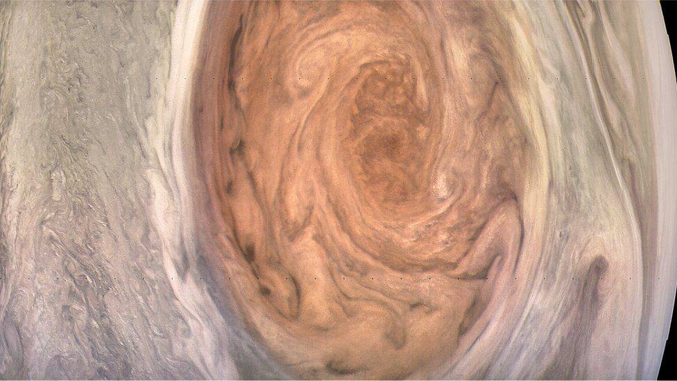 Esta semana la sonda espacial de la NASA Juno captó unas increíbles imágenes en primer plano por primera vez de la Gran Mancha Roja de Júpiter que se acaban de hacer públicas.