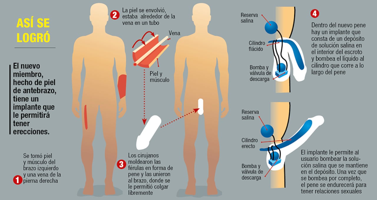 Para hacer el órgano, los expertos tomaron piel y músculo de su brazo y una vena de la pierna derecha. La piel fue moldeada en torno a la vena para que luciera como un pene. Una vez listo, llegó el momento de implantarlo en su puesto. Pero en la cirugía surgió una complicación debido a falta de oxígeno en la sangre, por lo que los médicos tuvieron que abortar el procedimiento y conectarle el nuevo pene de 15 centímetros al brazo izquierdo de manera temporal, con el fin de mantener el tejido del miembro sano.