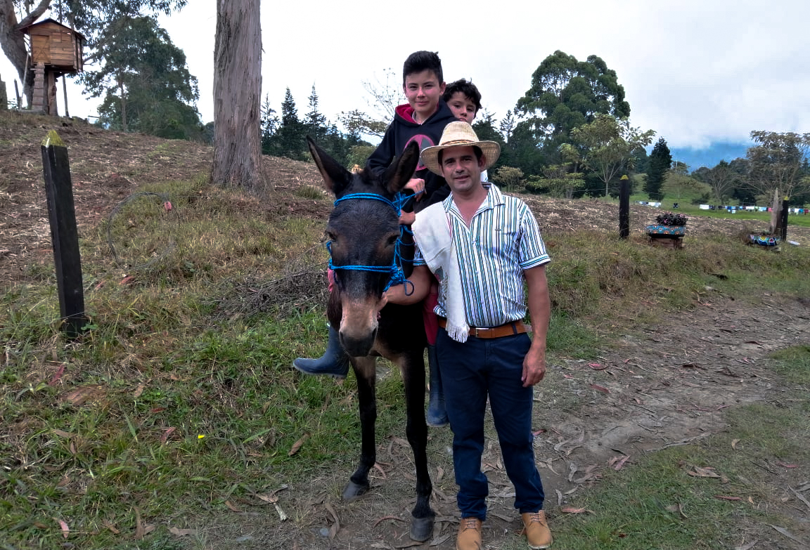 En la foto se ve a Fabio con dos de sus hijos y la mula que lo acompaña en las labores que realiza en la finca.