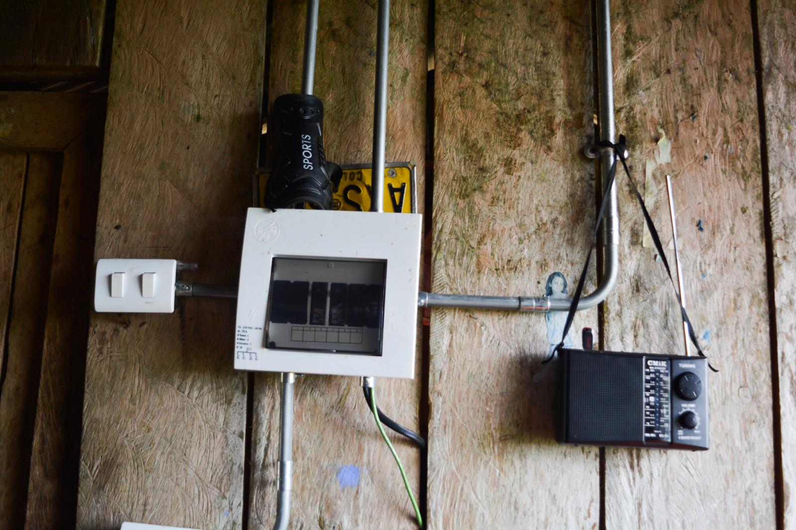 Esta fuente de luz la hicieron de un radio recargable. El hermano de Maria Maiby Muñoz, lo hizo, sacó la batería de un radio recargable, y con ella lo armó. Se trata de una USB conectada a 12 voltios y así alumbra. Fue la salvación de la familia muñoz cuando las mecheras no prendian. Ahora con los paneles ven mejor. El sol es capaz de sustituir cargadores, baterías y linternas, incluso una vez ha desaparecido del horizonte. © Brenda Guerrero.