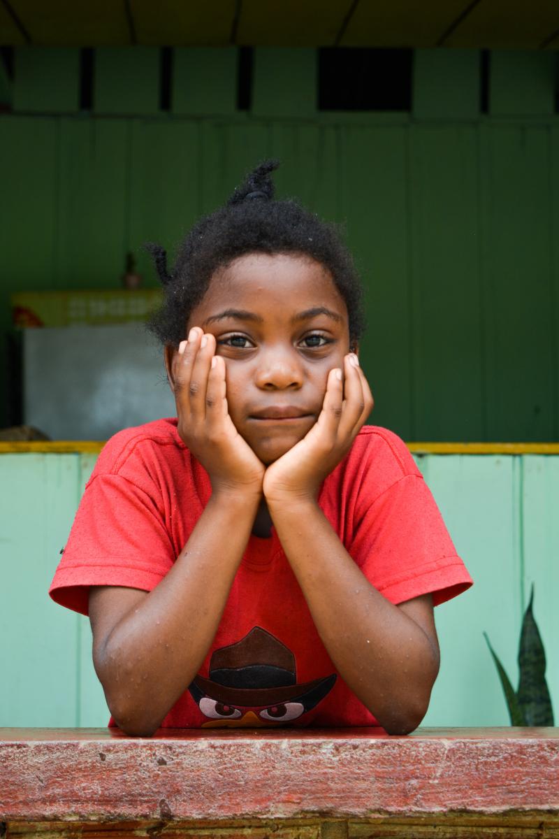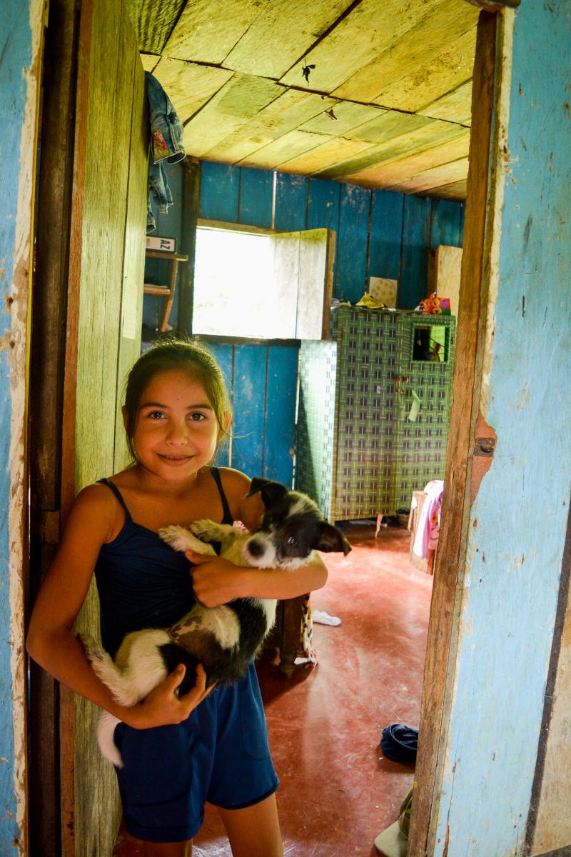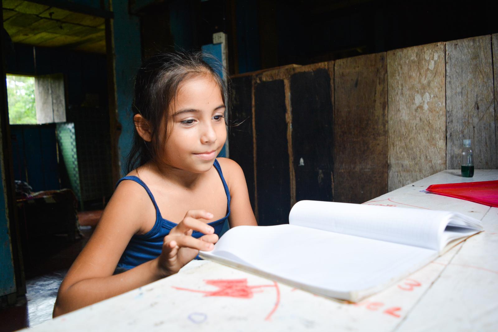 Camila Rosales es una de las dos niñas a quien la profesora da clases. Va en quinto semestre y está aprendiendo fracciones. Ya sabe dividir por dos cifras. “Mi mamá trabaja raspando coca y cocinando” y mientras ella trabaja, la pequeña va donde su abuela que vive a cinco minutos de la vereda. © Brenda Guerrero.